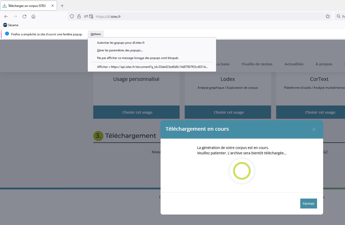 Si votre fichier ne se télécharge pas c’est parce que Firefox a empêché Istex-DL d’ouvrir une fenêtre popup. Dans l’onglet option « Autoriser les popups pour dl.istex.fr ».